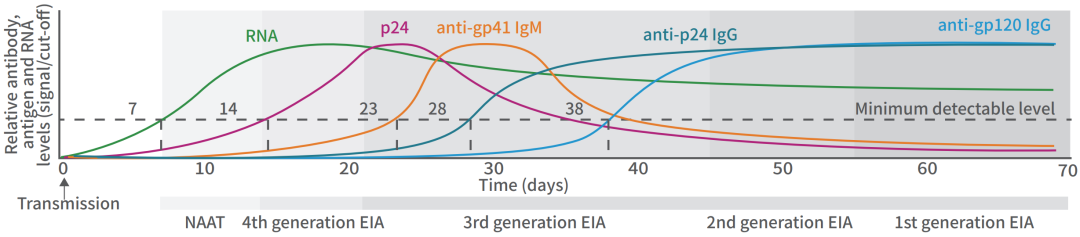 P24蛋白是一種構(gòu)成HIV的核心或“核衣殼”結(jié)構(gòu)蛋白。人體感染HIV病毒早期,血清中會(huì)出現(xiàn)高水平的P24抗原。因此通過檢測(cè)P24抗原可將HIV檢測(cè)窗口期提前至14天(如下圖),有利于在暴露后早發(fā)現(xiàn)HIV感染并及時(shí)進(jìn)行治療。