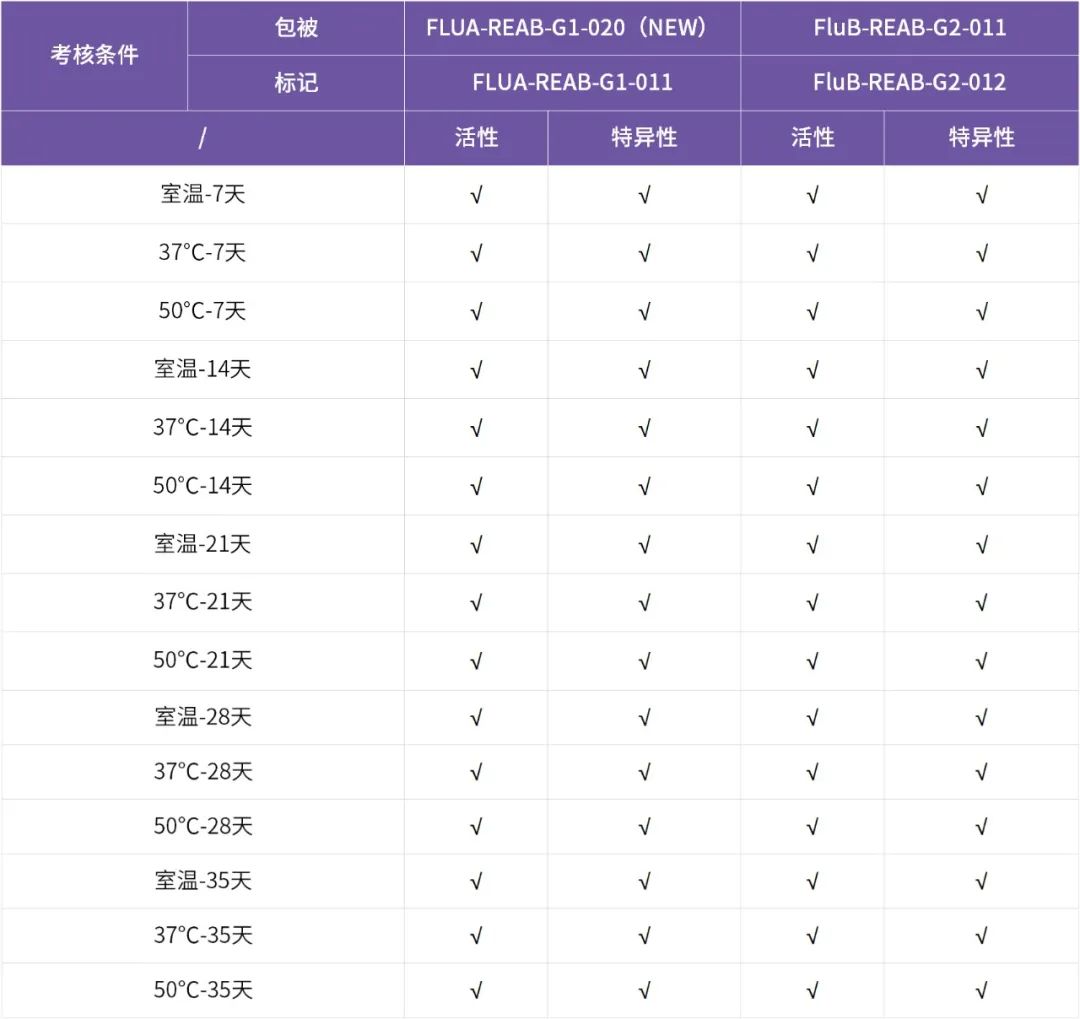 將菲鵬生物流感A與B配對(duì)產(chǎn)品在進(jìn)行反復(fù)凍融、超低溫保存時(shí)間、不同溫度與不同時(shí)間進(jìn)行考核后,產(chǎn)品物理性能無明顯變化,活性、特異性和交叉性均無變化,產(chǎn)品穩(wěn)定性優(yōu)良。